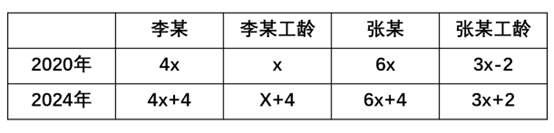 2020年时,李某的年龄是自己工龄的4倍,且正好是张某年龄的2/3。到20