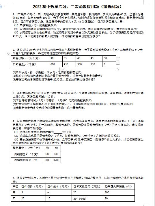 2022初中数学专题:二次函数应用题(下载版)