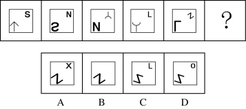 第一段图中,第一个图上下翻转后与第二个图相加,得到第三个图;第二段图应用规律,第一个图上下翻转后,与第二个图相加,得到D项图形。