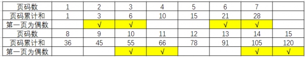 将1页的页码放在第一页,将所有偶数页的论文放在其后(一共7篇),根据“偶+奇=奇”,可知从第二篇开始,所有偶数页的论文第一页都是偶数页码,一共七篇;
