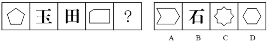 图形线条数或汉字笔画数均为5,问号处应选择图形线条数或汉字笔画数为5的图形,只有B项符合。