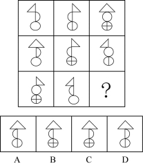 第一行,顶端的三角形有向左、向右和大等腰三种,中间的圆,有向左的半圆、向右的半圆和大圆三种,底端的圆有空白圆、一个带竖线的圆和一个带两十字的圆,第二行验证符合规律,第三行缺一个大三角形、向右的半圆和一个带竖线的圆,只有D项符合。