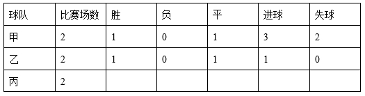 由表可知,甲、乙均为1胜1平0负,则甲、乙所战胜的都只能是丙队,即丙队为2负,又因只比赛了两场,同时平局也出现在甲乙之间的比赛中;根据乙没有失球,可知平局为0:0;再根据乙进1球,且战胜丙,可知乙丙比赛为1:0;则甲的3个进球和2个失球均在与丙的比赛中产生,所以甲、丙进球比为3︰2。