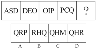 所有图形的面数量均为2,因此问号处也要选择一个面数量为2的图形,排除A、C项。又发现,题干中每幅图前一个图形中最右边的字母都在相邻的后一个图形的最左边,依此规律,问号处所填图形最左边的字母应为Q,排除B项,只有D项符合。