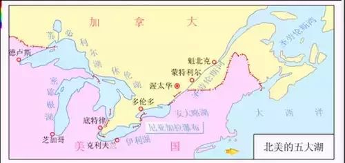 北美五大湖,相互连成群。