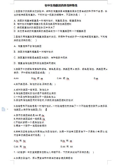 2022年初中生物基因的显性和隐性练习答案(下载版)