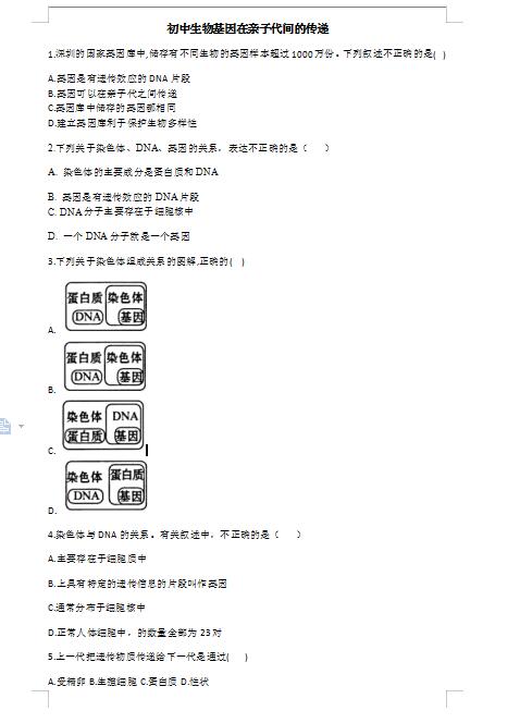2022年初中生物基因在亲子代间的传递练习题(图片版)