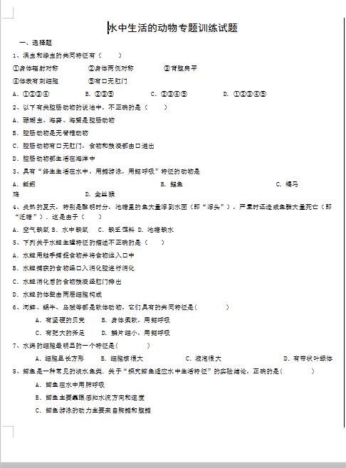 2022年初中生物水中生活的动物专题训练试题答案(下载版)