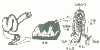 (5)小肠:小肠盘曲在腹腔里,长约5~6米,开始的一段叫十二指肠。小肠是消化道中最长的段,是消化食物和吸收营养物质的主要场所。小肠壁也分为4层,与胃壁相似。小肠黏膜的表面有许多环形皱襞,皱襞上有许多绒毛状的突起——小肠绒毛(如图)。小肠绒毛间的黏膜凹陷形成肠腺,可以分泌肠液消化食物。小肠内表面具有的皱襞和小肠绒毛,大大地增加了消化食物和吸收营养物质的面积、小肠绒毛中有毛细血管和毛细淋巴管。小肠绒毛壁、毛细血管壁和毛细淋巴管壁都很薄,都只由一层上皮细胞构成。这种结构特点有利于吸收营养物质。