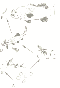 生物的富集作用是指环境中的一砦有毒物质(如重金属、化学农通过食物链在在生物体内大量积聚的过程。当人类排放的有毒物质进入生态系统后,这些有毒物质一般不易分解、不易排出,所以会通过食物链不断积累,最终威胁人类自身。如图是淡水生态系统中的一条食物链,即:A微小的水生生物→B 剑鱼蚤→C蜻蜓的幼虫→D小鱼→E大鱼。图中的黑色小点表不排入水中的某有毒物质。在此食物链中,大鱼位于最高营养级,它体内的有毒物质最多。