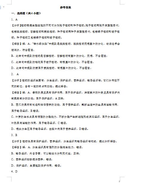 2022年初中生物植物体的结构层次提升练习答案(图片版)