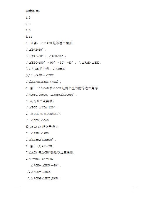 2022年初中数学等边三角形第1课时练习题答案