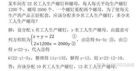 本题的第一个等量关系比较容易得出:生产螺钉和螺母的工人共有22名;第二个等量关系的得出要弄清螺钉与螺母是如何配套的,即螺母的数量是螺钉的数量的2倍(注意:别把2倍的关系写反)。