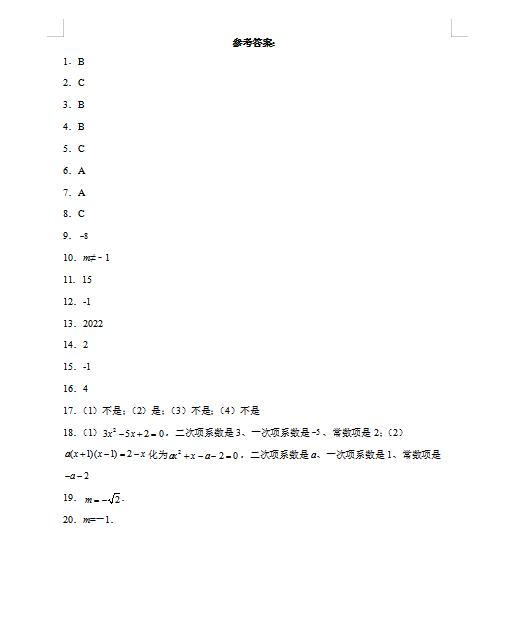 2022年初中数学元二次方程专题练习二答案(图片版)