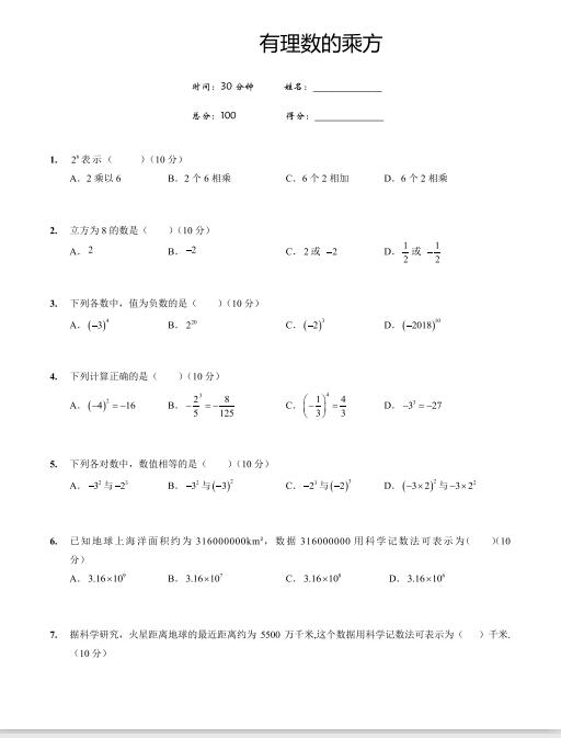 2022年初中数学有理数的乘方练习题