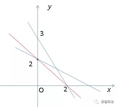 3. 观察图像可以看出,根据参数a不同,动直线绕点(0,2)旋转。当两直线交于点(2,0),动直线斜率为-1,如图中红线所示。若动直线逆时针旋转,斜率增加,交点就一定在第一象限,否则交点在二或四象限,故有: