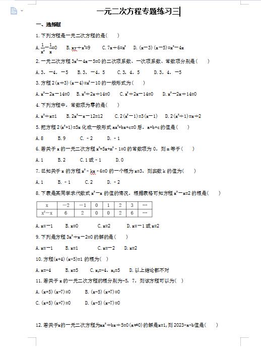 2022年初中数学一元二次方程专题练习三(图片版)