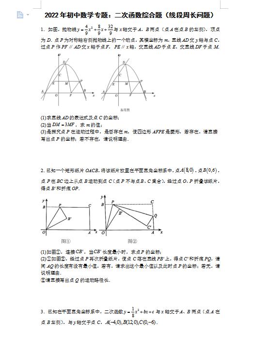| 《2022年初中数学专题:二次函数综合题(线段周长问题)(下载版)》 |