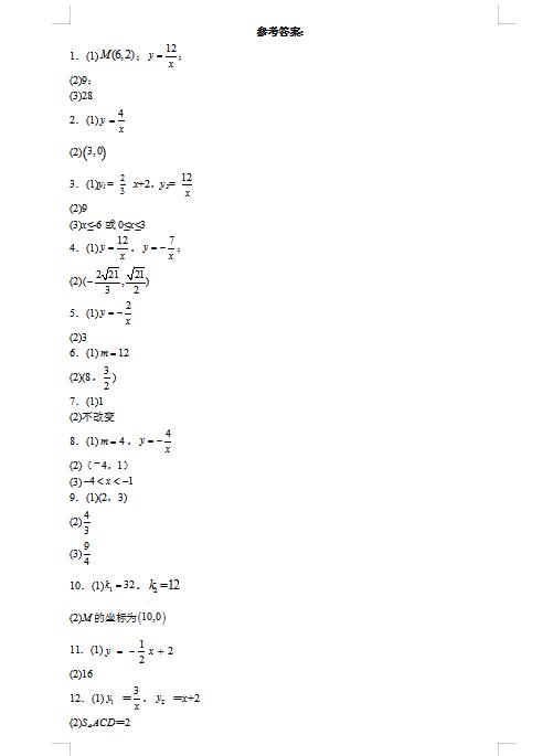 2022年初中数学专题:反比例函数与几何综合题答案(图片版)