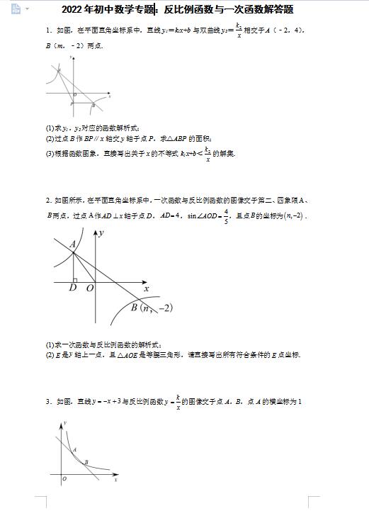 2022年初中数学专题:反比例函数与一次函数解答题(图片版)
