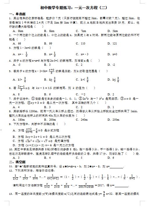 2022年初中数学专题练习:一元一次方程二(图片版)