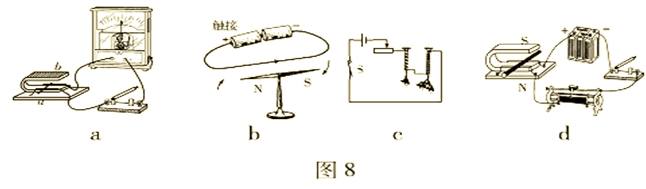 【例】如图8所示的四个装置,以下关于它们的说法中错误的是()A.图a可用来演示电磁感应现象B.图b可用来演示电流的磁效应C.图c可用来演示电磁铁中线圈匝数与磁性强弱的关系D.图d可用来演示发电机的工作原理【技巧规律】电动机与发电机:它们的构造大致是一致的。主要的区别可通过下表来区分。