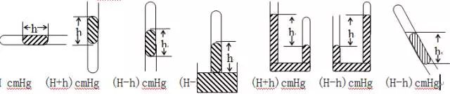 D若外界大气压为H cmHg 试写出下列各种情况下,被密封气体的压强(管中液体为水银)。