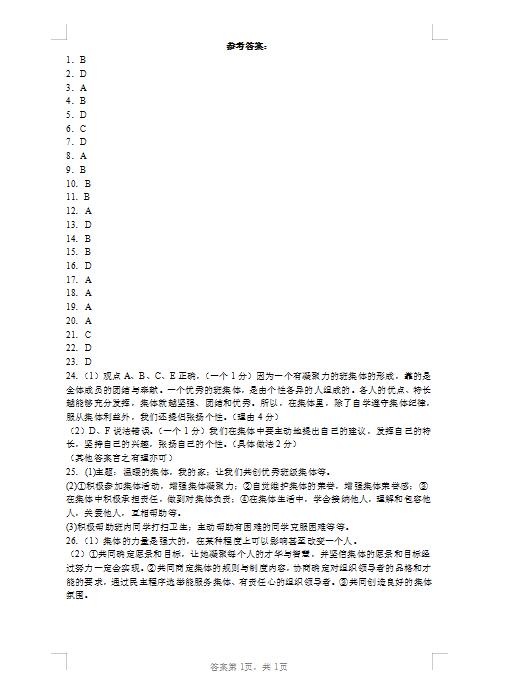 2022年初中政治我与集体共成 课时训练答案(图片版)