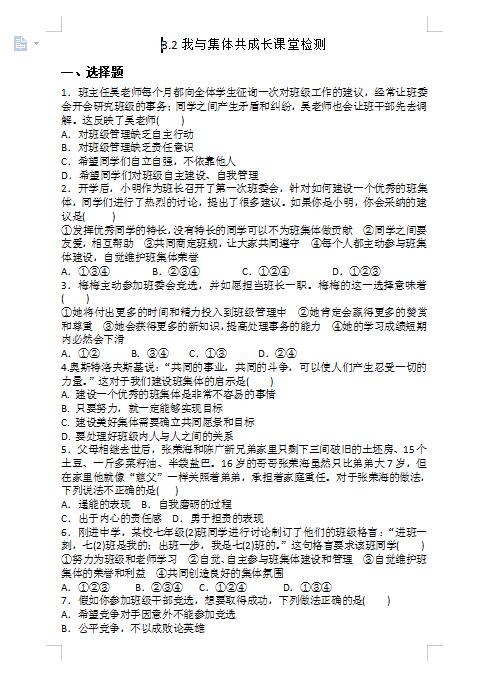 2022年初中政治我与集体共成长课堂检测(下载版)