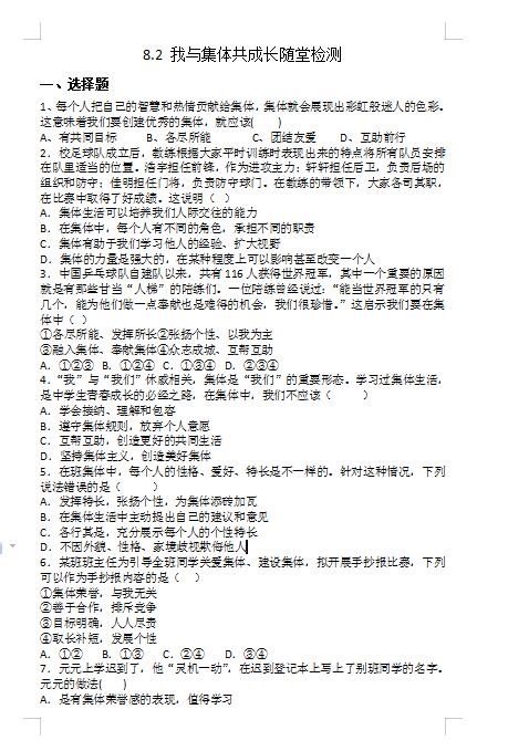 2022年道德与法治我与集体共成长随堂检测(图片版)