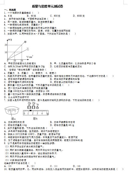 2022年人教版八上物理质量与密度单元测试卷答案(图片版)