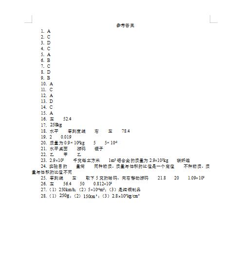 2022年人教版八上物理质量与密度章末测试卷答案(图片版)