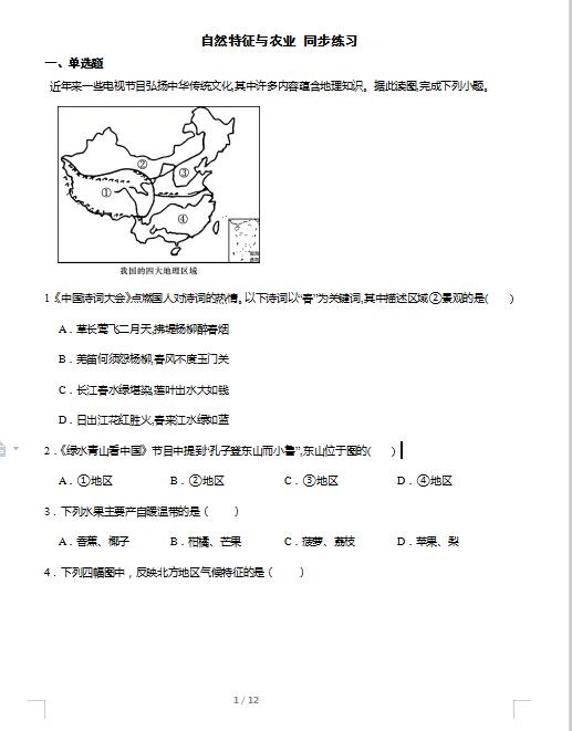 2022年人教版八下地理自然特征与农业同步练习(下载版)