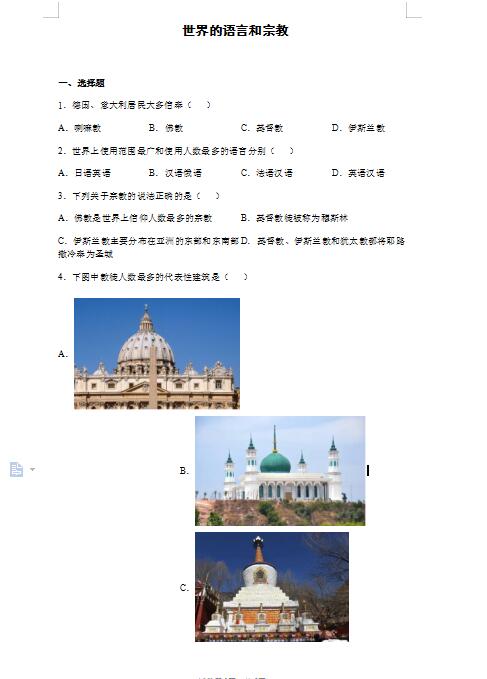 2022年人教版地理七上世界的语言和宗教达标练习(下载版)