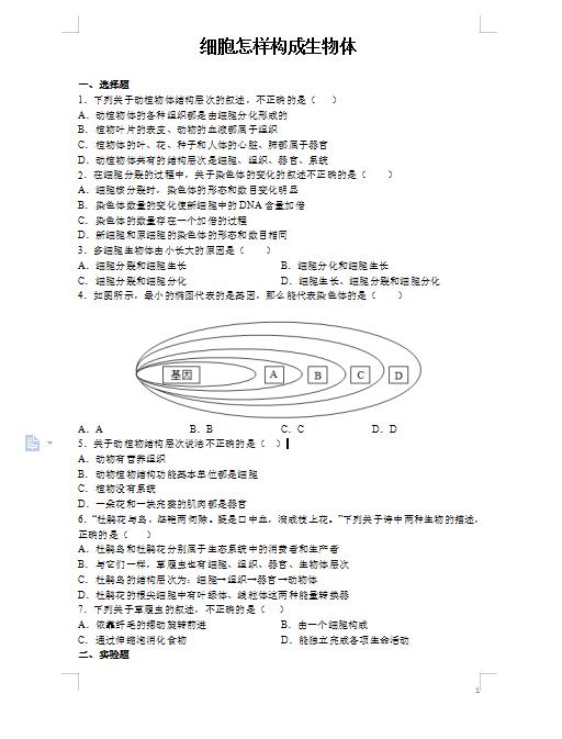 2022年人教版七上生物细胞怎样构成生物体练习题答案(图片版)