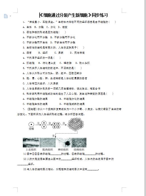 2022年人教版生物七上动物体的结构层次同步练习3(图片版)