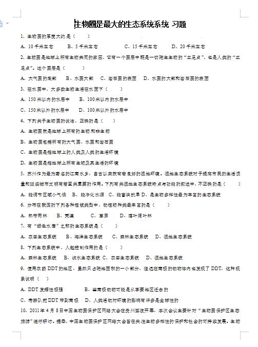 2022年人教版生物七上生物圈是最大的生态系统习题(下载版)
