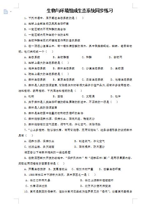 2022年人教版生物七上生物与环境组成生态系统同步练习答案(下载版)