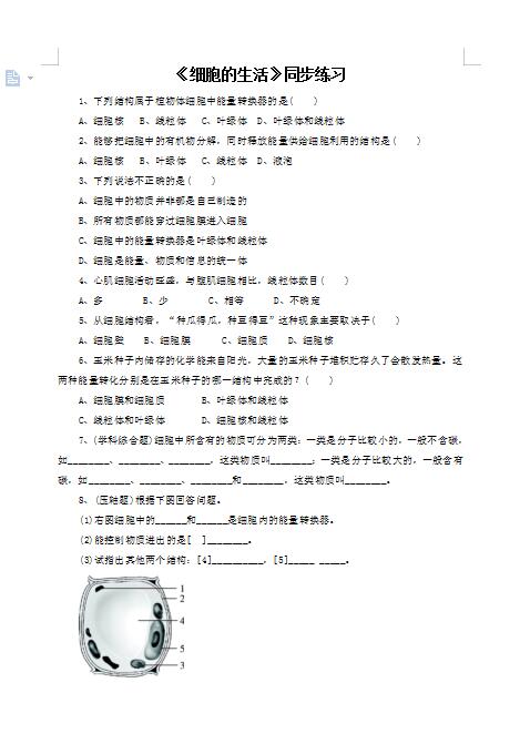 2022年人教版生物七上细胞的生活同步练习2答案(下载版)