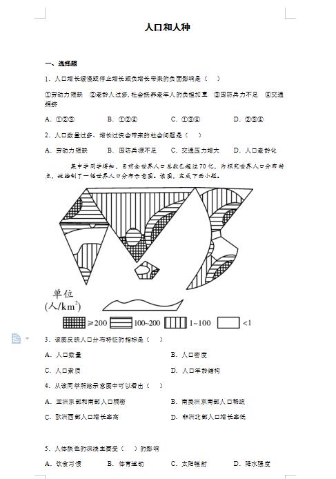 2022年七上地理人教版人口和人种 一课一练(图片版)