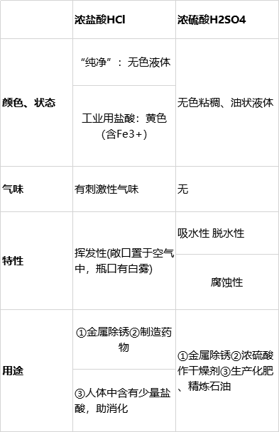 1、浓盐酸、浓硫酸的物理性质、特性、用途.