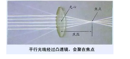 3.焦点:平行于凸透镜主光轴的光线经凸透镜后会聚于主光轴上一点,这点叫焦点,用“F”表示