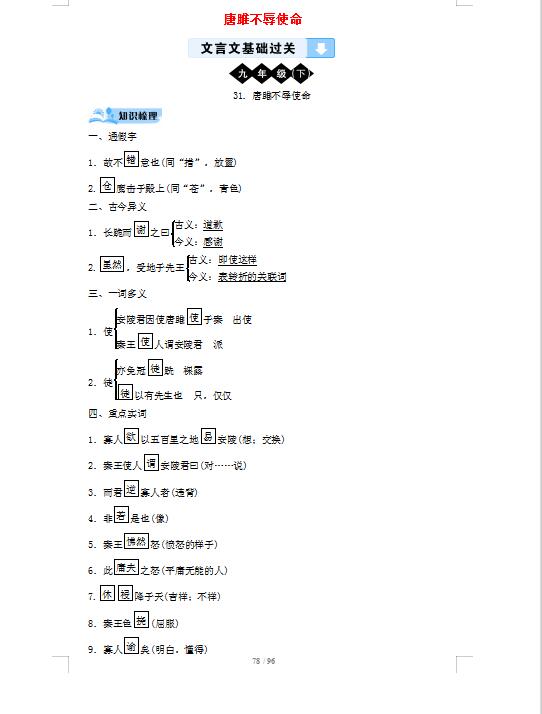 2023年部编初中语文唐睢不辱使命文言文重点知识全解析