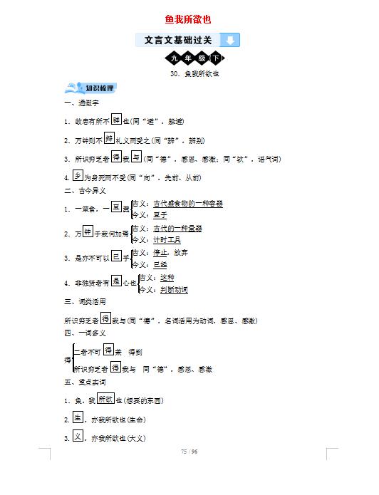2023年部编初中语文鱼我所欲也文言文重点知识全解析