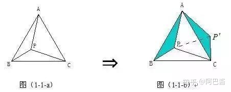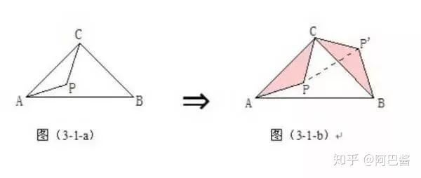 在正ΔABC中,P为ΔABC内一点,将ΔABP绕A点按逆时针方向旋转60°,使得AB与AC重合。经过这样旋转变化,将图(1-1-a)中的PA、PB、PC三条线段集中于图(1-1-b)中的一个ΔP'CP中,此时ΔP'AP也为正三角形。
