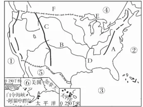 (2)美国北邻国家F 加拿大 ,南邻国家⑤ 墨西哥 ,东南临③ 墨西哥 湾,东临②大西洋,西临①太平洋。