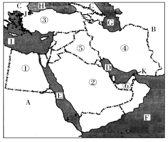 (1)中东地区被称为“三洲五海之地”,图中A为非洲,B亚洲,C欧洲;D为 波斯 湾,E 红 海,F 阿拉伯 海,G 里 海,H黑海,I地中海。