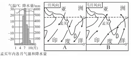 (2)图A中季风名称是东北季风,此时印度处于旱季;图B中季风名称是西南季风,印度处于雨季。印度旱涝灾害主要是季风不稳定导致的。
