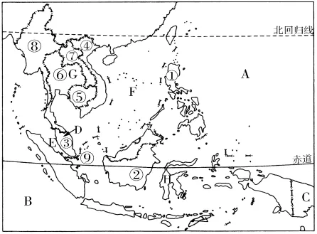 (1)填出图中序号代表的国家:① 菲律宾 ,②印度尼西亚 ,③ 马来西亚 ,④越南 ,⑤ 柬埔寨 ⑥ 泰国 ,⑦ 老挝 ,⑧ 缅甸 ,⑨ 新加坡 。