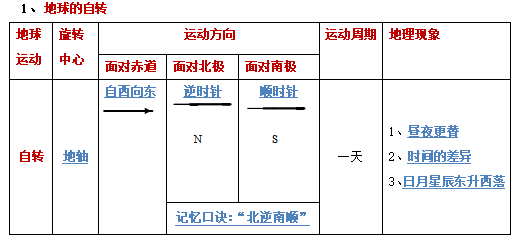 | 地球运动 | 中心 | 运动方向 | 周期 | 地理现象 |